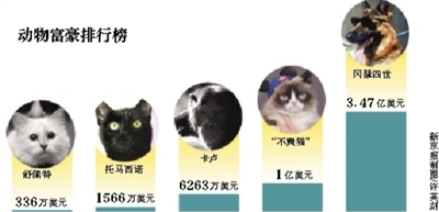 得到巨额遗产的托马西诺一跃登上“动物界富豪排行榜”。动物界另一位大富豪则是一只名叫“卡卢”的大猩猩,主人留给它约6263万美元遗产。如此看来,占据动物富豪排行榜,有三位都是继承财产的土豪们。