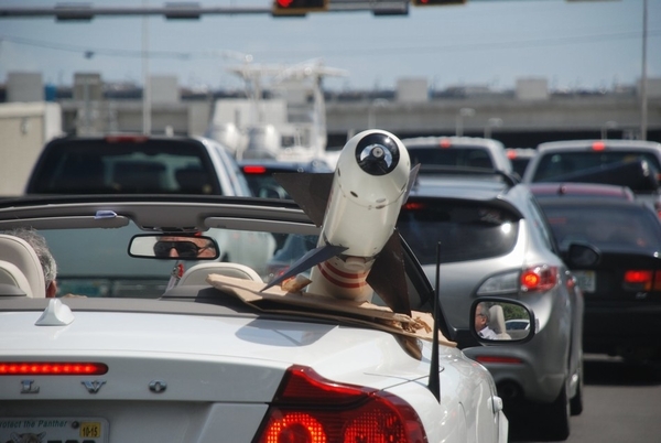 2015年6月4日消息,近日,加州街头拍到少见景象,一名男子的敞篷轿车内副驾驶座椅上“坐着”一枚空空导弹,两“人”就这样招摇过市,该导弹是以色列制蜻蜓-2红外格斗弹。据该男子称导弹是几十年前一位朋友在棕榈滩为以色列国防军募集经费的拍卖中获得,现在他从朋友遗孀处获得这枚导弹,并用汽车拉回家。