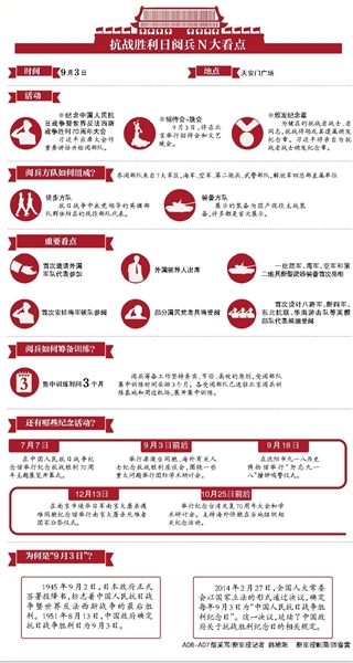 除9月3日当天举行的纪念大会之外,从7月7日开始到12月份,全国还将举行包括主题展览、国际学术研讨会、撞钟鸣警仪式、公祭仪式等一系列活动,纪念中国人民抗日战争暨世界反法西斯战争胜利70周年。