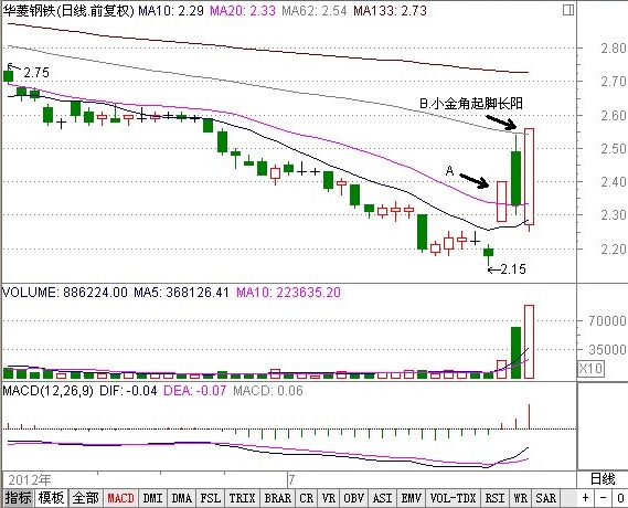 我们看到“华菱钢铁”的第二天采取了高开低走,基本上没有多大的出货空间。这时就必须严密监视它!第三个交易日,在触碰到10天均线的时候(参图中a)。该股走出了一个经典的小金角起涨长阳(参图B)。快速封板。没有给过多的时间整理,干脆利落。