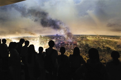 7月5日,几名记者在观看卢沟桥事变“半景画”。昨日,抗战胜利70周年主题展览在抗战馆开幕。新京报记者 浦峰 摄