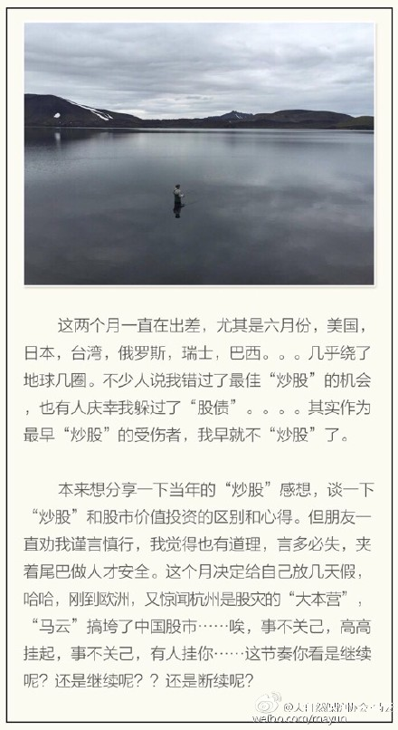 本来想分享一下当年的“炒股”感想,谈一下“炒股”和股市价值投资的区别和心得。但朋友一直劝我谨言慎行,我觉得也有道理,言多必失,夹着尾巴做人才安全。这个月决定给自己放几天假,哈哈,刚到欧洲,又惊闻杭州是股灾的“大本营”,“马云”搞垮了中国股市……唉,事不关己,高高挂起,事不关己,有人挂你……这节奏你看是继续呢?还是继续呢??还是断续呢?