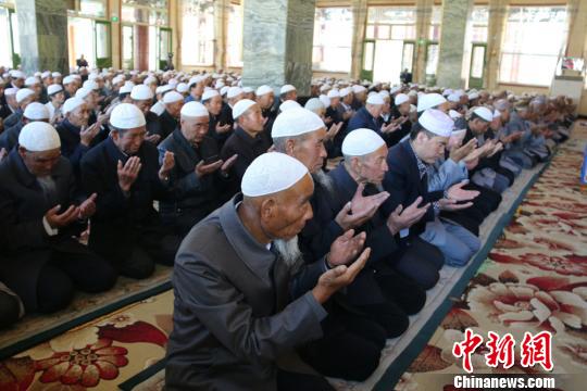 7月17日,中国伊斯兰教西道堂各族穆斯林在临潭清真西大寺庆祝一年一度开斋节,宣讲“铭记历史 珍爱和平”主题卧尔兹,举行和平祈祷大会。图为穆斯林为国家繁荣昌盛、人民幸福安康、世界和平安宁祈祷。 徐雪 摄