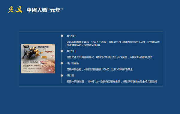 事实上,“中国大妈”抢购黄金并非第一次。回顾两年多前的2013年4月,她们所谓“与国际金融大鳄角力”,疯狂哄抢黄金一战成名,导致国际金价创下2013年内最大单日涨幅。