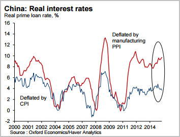 牛津大学经济学亚当·斯莱特(Adam Slater)表示,2014年底的宽松措施没有跟上紧缩条件的步伐。自2014年中期实际汇率已上升15%,主要是由于中国与美元挂钩以及日元贬值。
