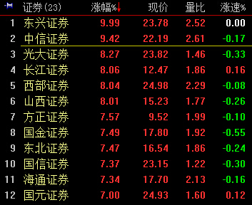 14:06,证券板块涨7.58%,东兴证券涨停,中信证券、光大证券、西部证券涨逾8%,个股全线大涨。