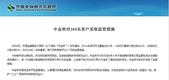 FX168讯中国金融期货交易所周三(8月26日)发布通知,对152名单日开仓量超过600手、13名日内撤单次数达到400次、一名自成交次数达到五次,共计164名(去除重复)股指期货客户采取限制开仓一个月的监管措施。