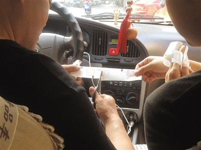 王晓在自己驾驶的快车上,向记者演示了打票机的用法。