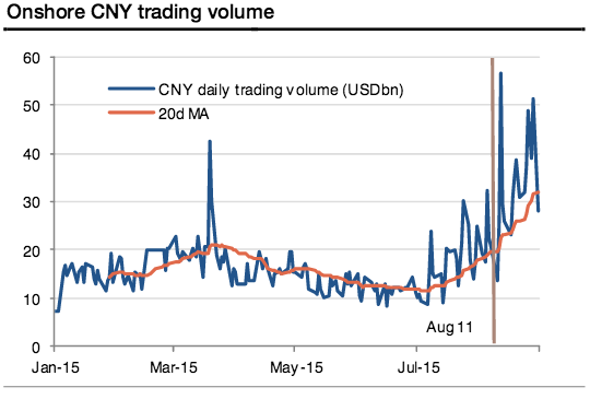 8月11日之后的15个交易日中,在岸人民币成交量相比于之前20个交易日以及今年迄今的平均水平增长了近一倍