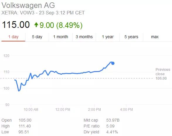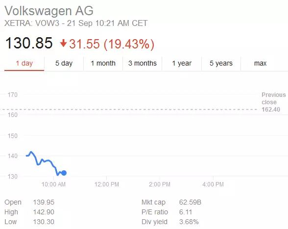 但是那些购买大众股票的投资们就没有这么淡定了,北京时间21日下午欧洲股市开盘后,大众汽车在法兰克福的股价一度跌超19%至130欧元水平,创下2008年11月3日以来最大跌幅,年内跌幅扩大至25%,市值降到653亿欧元(739亿美元)。