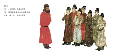 《步辇图》中绯衣官员(左),陕西乾县唐代李重润墓壁画中紫、绯、绿、青品官服色。