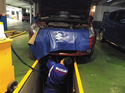 9月30日上午10点17分,记者随同专家、车主一同抵达位于丽泽桥的北方新兴铃木丽泽桥4S店。进入该店后,引导人员直接将车引导入车间内,而一旁就是接待区,空间利用率较好。随即服务顾问便开始接待,经过了环检、问询环节,将车辆驶入等候区,同时给了车主一张“问诊/预检表”,并将车辆要检测的项目注明,且将大致金额告知车主。记者一行随后进入休息区,该休息区位于车间上方,可以通过窗户直接观察楼下车检情况。服务人员服务意识较强,主动询问客户需求。