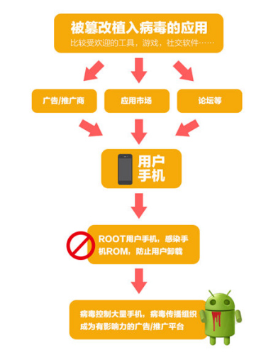 猎豹移动安全专家介绍说,病毒主要通过正规应用市场进行传播。病毒开发者绕过应用市场的安全监控,把带有恶意代码以及广告组件的流行应用提交发布,目前在Google Play及国内多个应用市场都发现了带毒应用。截至发稿前,带毒应用已被下架。
