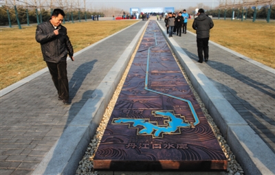 2014年12月27日,南水北调中线一期工程总干渠终点团城湖明渠,一位男士欣赏南水北调流经区域地图,北京市南水北调工程正式通水。新京报记者 薛珺 摄