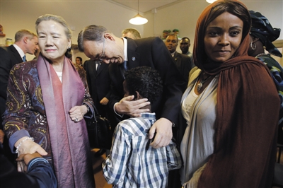 17日,意大利罗马,联合国秘书长潘基文和妻子造访难民营,与难民儿童交流。潘基文告诉难民儿童不要绝望,称他小时候也曾经历因战争逃亡的日子。