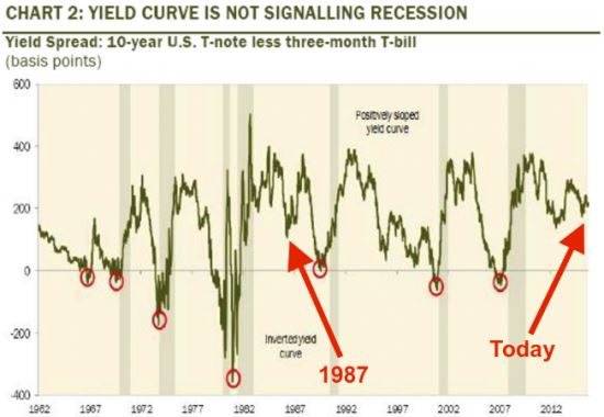 Rosenberg在报告中写道:“在1987年股灾之时,有一个没有出现的现象就是收益率曲线倒置(2007年发生了倒置!),而是继续保持正值,就像今天一样(如果联储一直按兵不动,收益率曲线还将保持在当前位置)。它所发出的信号是经济扩张和股市牛市还将持续数年(准确地说是3年)。”