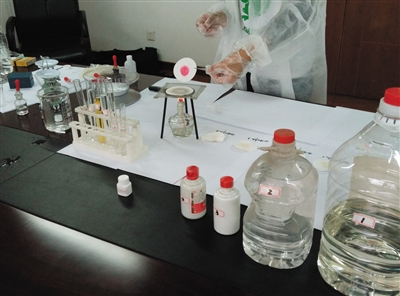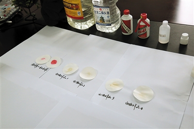 10月22日,新京报记者在北京某酒类批发市场购买了四种浓香和酱香型白酒,分别对其样品进行了敌敌畏成分检测实验。