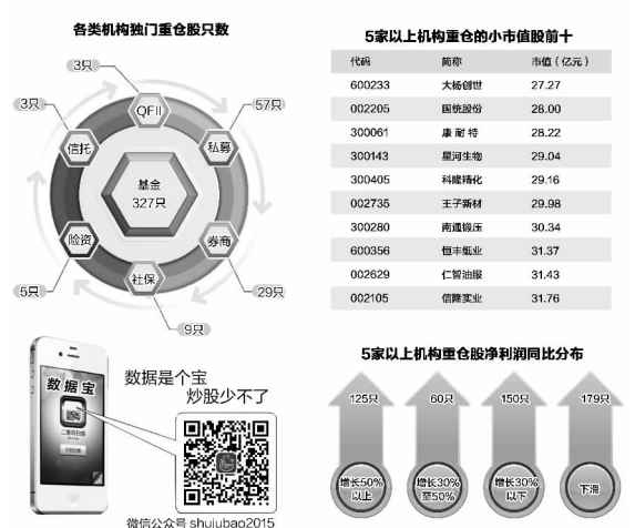 数据宝统计,机构抱团股二级市场表现给力,5家以上机构持有个股10月以来平均上涨22.73%,远远超过上证指数同期12.50%的涨幅。值得关注的是,小市值股受机构青睐,89只个股市值低于50亿元。例如,集聚了8家机构的汇中股份市值低于40亿元,10月以来上涨四成,股价高于大盘4000点水平。