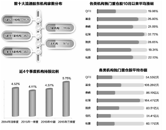 证券时报股市大数据新媒体平台“数据宝”统计,截至昨日,1118家公司披露三季报,九成公司前十大流通股东中(包含由于持股数相同,超过10家机构并列入围的情况)出现基金、社保、QFII、信托等机构身影。三季度,上证指数从4000点跌至最低2850点,9月份在3000点至3200点运行区间窄幅波动,机构悄然加仓,持股比例由中期的4.37%跃升至5.75%。值得关注的是,361家公司三季度机构家数超过中期,其中,74只个股股价率先回到8月大盘4000点时水平。