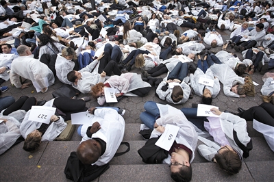 10月29日,纽约,叙利亚美国医学协会成员等人“躺尸”示威,抗议670名医疗工作者在叙利亚危机中丧生,批评美国对“伊斯兰国”的政策。图/CFP