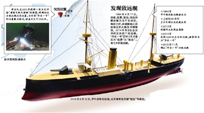 发现致远舰独有的穹甲钢板和方形舷窗。
