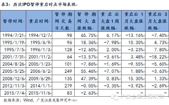 我们统计了历次IPO暂停期间,以及重启后1周、1月以及3月的上证综指涨幅情况。整体来看,IPO重启后,不同时期市场涨跌不一,从历次的情况来看,IPO重启并不是决定短期大盘走势的决定性因素。