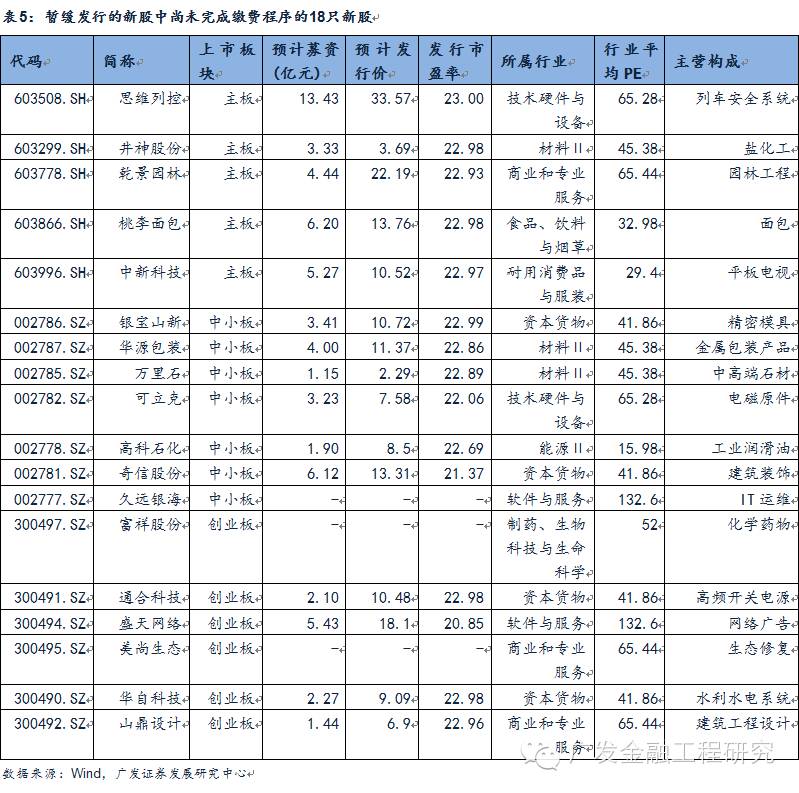而剩下的18家则分别是:中新科技(603996)、桃李面包(603866)、乾景园林(603778)、思维列控(603508)、井神股份(603299)(上述5家拟上交所上市);万里石(002785)、久远银海(002777)、华自科技(300490)、华源包装(002787)、富祥股份(300497)、山鼎设计(300492)、可立克(002782)、奇信股份(002781)、盛天网络(300494)、通合科技(300491)、美尚生态(300495)、银宝山新(002786)、高科石化(002778)(上述13家拟深交所上市)。