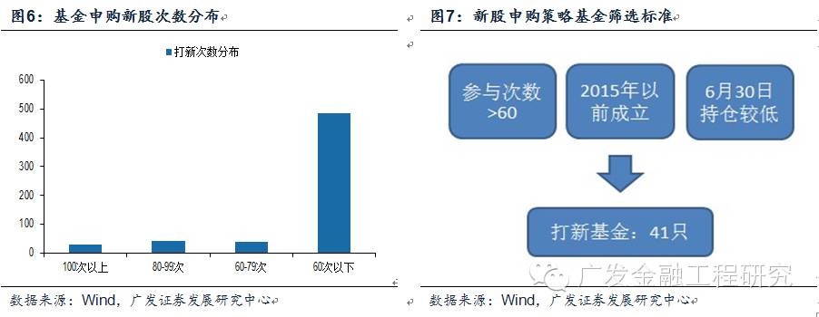 新股申购所需资金较大,机构投资者是打新的主力。由于2015年上半年度新股申购收益稳定,多只基金都积极参与打新。经统计,上半年共有598只基金参与了新股申购,总计申购次数16167次。由于没有专门的新股申购策略基金,因此我们从混合型股票基金中筛选可能的新股申购策略基金,筛选标准为:2015年打新次数超过60次;成立日在2015年之前;以及2015年6月30日持仓较低的基金。共筛选出41只新股申购策略基金。