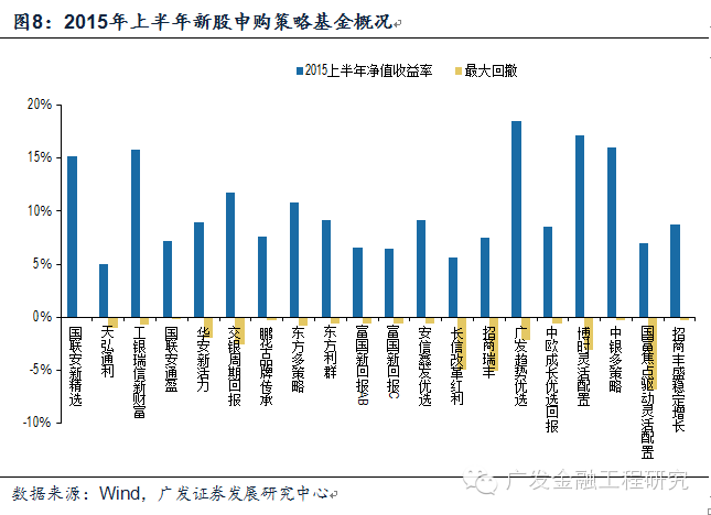 在筛选出的这41只新股申购策略基金中,2015年打新次数最多的参与126次,平均参与93次。2015年上半年平均收益11.2%,平均最大回撤2.2%。同期货币基金平均七日年化收益率为4.34%。总体来看,新股申购策略基金表现由于货币基金。