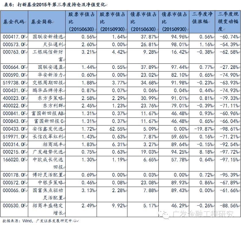 在2015年7月4日证监会暂停IPO之后,多数新股申购策略基金在2015年第三季度降低了股票的仓位,同时大幅增加了债券的仓位。截至2015年9月30日,多只打新基金的债券持有仓位在80%以上,多数新股申购策略基金在三季度净值几乎没有变化,而规模均出现了大幅的下降。