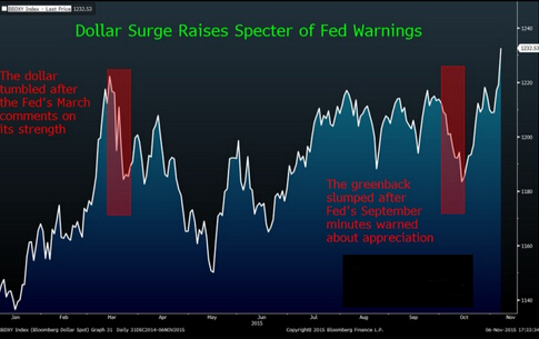 投资者已经增加了对美联储将在12月份加息的押注。如果他们预计的紧缩步伐比决策者们所认为的合理速度更大,可能刺激美元进一步上扬,减缓出口,进而损伤美国经济。