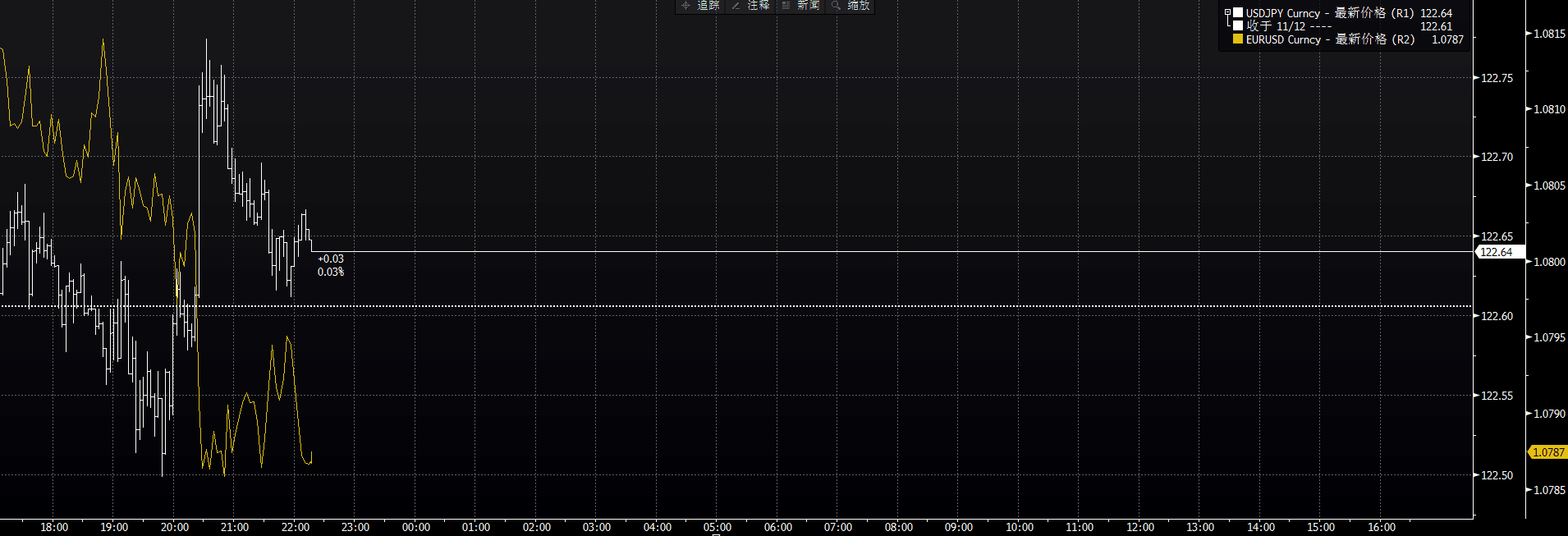 美元对日圆(白线)与欧元对美元(黄线)走势对比