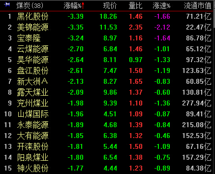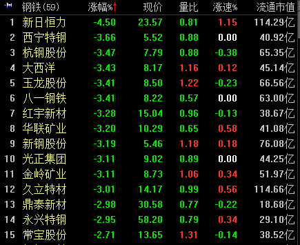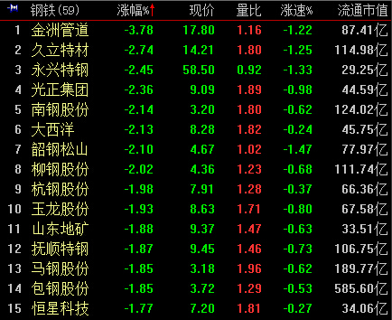 9:39,煤炭、钢铁跌幅均超1%,黑化股份、宝泰隆、久立特材等领跌,两板块个股无一翻红。