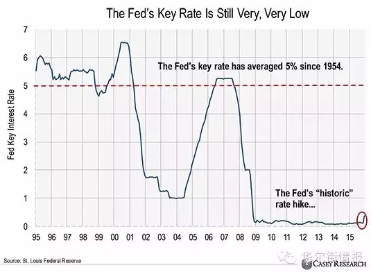 图:美联储的关键利率仍然非常非常低,自1954年以来,美联储的关键利率平均为5%