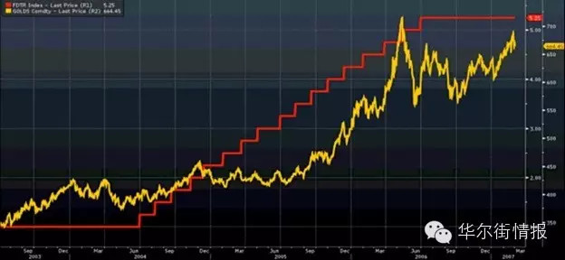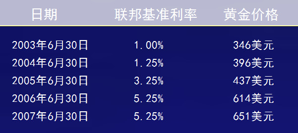 在那个时候,市场上有种类似的观点,即认为提升的利率会损害黄金在2001和2002年获得价格上涨。然而,利率提升期间,黄金的价格从2003年6月的每盎司361美元上升到了2006年6月的每盎司633美元——上涨幅度为75%。