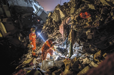 据救援消防队员说,目前共有五六处地点发现有生命迹象。现场可见,在标记有生命迹象的地点,消防员用生命探测仪引导指挥挖掘作业。