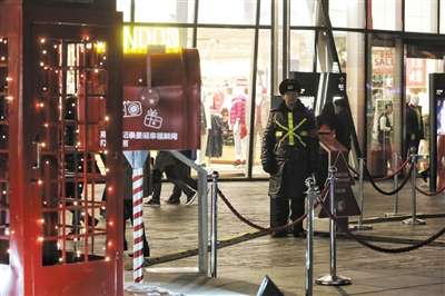昨晚8时,在三里屯的一家商铺前,一名保安站在圣诞节装饰前站岗。
