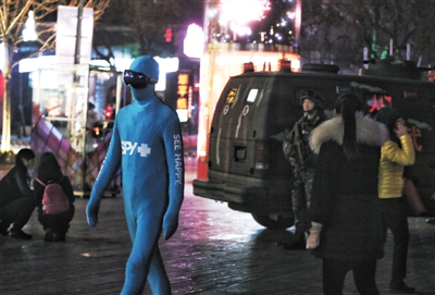 昨日下午,三里屯,过路市民好奇地向“雪豹突击队”张望。