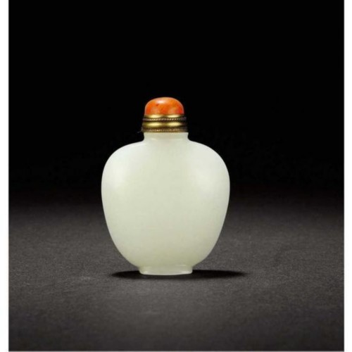 这些不同材质的鼻烟壶当中,玉鼻烟壶因其独特的材质,贯穿中华5000多年的玉文化,占有极其重要的位置。玉鼻烟壶虽然尺寸小巧,却兼具中国传统艺术的全部技艺:材 质、工艺、造型、纹饰、绘画、书法、雕刻等集于一身,融掏膛、阴刻、减低浮雕、篆刻等玉雕技法,制作极精妙,在清代玉雕作品当中占据极为重要的位置,于方寸之间,见乾坤之阔。乾隆时期,和田美玉年年源源不断地运进皇宫,翡翠也大量使用,为玉鼻烟壶的制作提供了极优秀的材料,特别是一些小而圆润的籽玉,温润 细腻,洁白无瑕,正是鼻烟壶的天赐美材。匠师们对材料巧加利用,或因此施艺,琢成天然随形之物,或巧运匠心,将其雕琢成各类应景题材,配以诗文,以彰吉祥文雅之意。