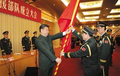 习近平将军旗郑重授予战略支援部队司令员高津、政治委员刘福连。新华社记者 李刚 摄