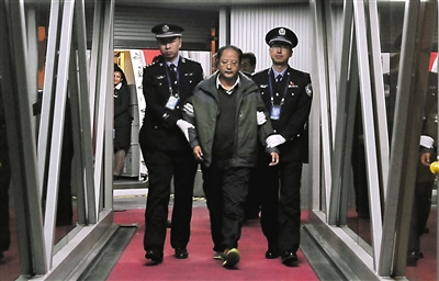 昨日,外逃6年的“百名红通”10号嫌犯裴健强被抓获归案。图为裴健强(中)被执法人员带离北京首都国际机场。 新华社发