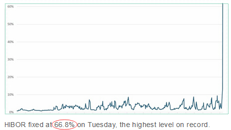 香港人民币隔夜银行间同业拆借利率(HIBOR)走势:创下66.8%的历史最高纪录