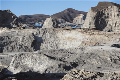 11日,三河段甲岭镇八百户村后山,巨大的矿坑旁边还摆放着用来筛山石的筛网。昨日,三河市端掉7个非法盗采粉石窝点。 新京报记者 彭子洋 摄
