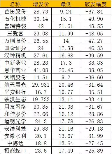 2015年定增实施破发的公司中,按最新收盘价计算,目前破发幅度居前的20只个股分别是: