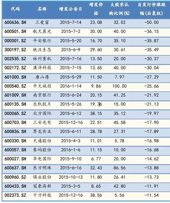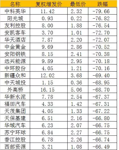 其中中科英华、阳光城、友利控股、安凯客车、华天酒店、中金黄金、安阳钢铁、远兴能源、中环股份等近10家公司较增发价跌幅超过7成。