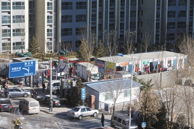 1月13日,前一天才交房的房山区昊天大街西侧的青春誌小区外,建起了5间与中海国际港小区相似的铁皮房,其中一间已贴上了“五金建材小卖部”的标识。该处还有两家装修公司展示位,据小区保安称,这两家装修公司已经“承包”了小区。