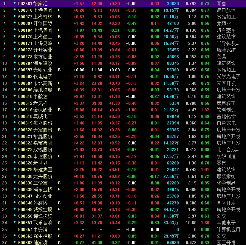 上海梅林、中海科技、浦东建设、浦东金桥、外高桥、强生控股、陆家嘴、上工申贝、张江高科、城投控股。