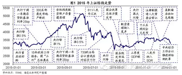 下半年的主题是风险和改革。“发酵”已久的美联储加息、6月份的“股灾”、8月份的人民币汇改都增加了风险,引起市场大幅动荡。尽管下半年央行进行了两次双降,推动了一波“小牛”行情,但由于降息空间受限,市场仍趋于震荡。政府在化解金融风险、稳增长的同时,积极推动各项改革措施。9月的国企改革总体方案、11月的十三五规划、12月的注册制落地和中央经济工作会议的供给侧改革,都展示了政府改革的决心和魄力,股市也呈现出慢牛行情。