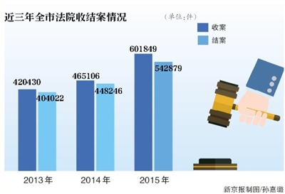 新京报讯 (记者王巍)2015年,北京全市法院收案、结案数量均再创历史新高,有的法院一线法官人均结案达300余件。在立案登记制实施后,法院全年受理行政案件15451件,同比上升70.2%。