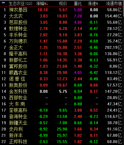 9:55,农业涨0.17%,生态农业概念板块涨0.9%,神农基因涨停,大北农、芭田股份、敦煌种业领涨。